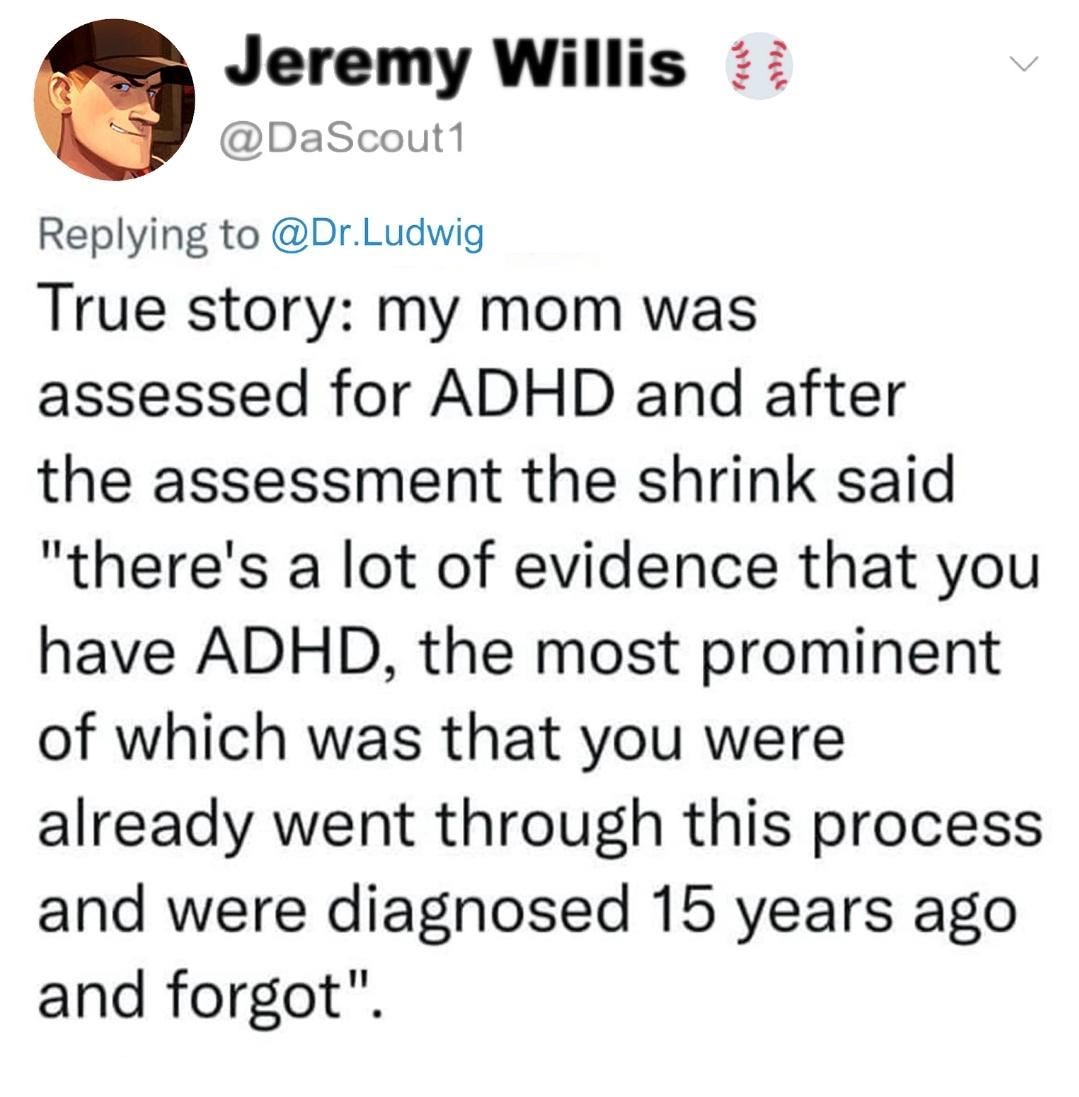 I haven’t been tested or diagnosed, but certain patterns seem to fit. The way my thoughts dart around faster than I can keep track of them. How I think I’ve said something but I just talked around it for ten minutes. The scattered to-do lists. The terrible memory. The feeling of being overwhelmed by simple tasks, but then being able to hyperfocus on others for hours. The number of situations where my husband would be quite justified in saying “well what did you think would happen?” but the truth is I didn’t think.